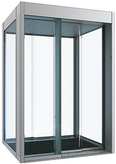 Har två dubbla skjutdörrar med fri passagebredd 896 mm och yttermått 1600 × 1600 mm.